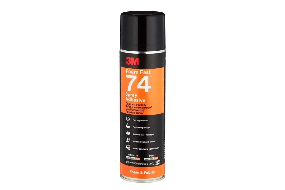 Najwyższej jakości szybko przylegający klej w sprayu 3M Scotch-Weld 74 klei elastyczne pianki poliuretanowe lub lateksowe do siebie oraz do innych materiałów (drewna, metalu, plastiku itp.).