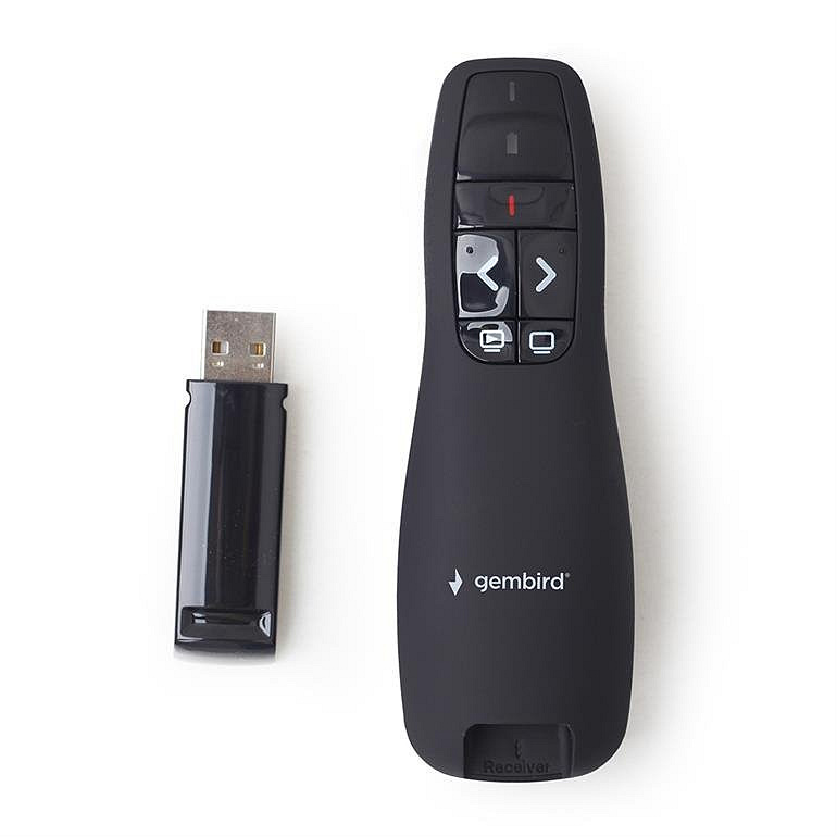 Bezprzewodowe połączenie, dzięki czemu możesz swobodnie poruszać się podczas prezentacji Łatwe w użyciu przyciski zapewniają doskonałą kontrolę nad prezentacją Praktyczny wskaźnik laserowy umożliwia podkreślenie dowolnej części prezentacji, nawet w najciemniejszych pomieszczeniach Plug & Play: wystarczy podłączyć i jest gotowe Właściwości Bezprzewodowy pilot do prezentacji w PowerPoint Czerwony wskaźnik laserowy do łatwego podkreślania szczegółów prezentacji publiczności 4 przyciski do sterowania najczęściej używanymi funkcjami prezentacji w PowerPoint: następny/poprzedni slajd, włączanie/wyłączanie ekranu, zakończenie/wznowienie prezentacji, włączanie/wyłączanie lasera Praktyczny wyłącznik Plug & Play, nie jest potrzebne żadne oprogramowanie Specyfikacje Interfejs: USB Klasa lasera: Klasa 2, EN 60825-1-2014 Maksymalna moc: Mniej niż 1 mW Długość fali: 640~660 nm (czerwone światło) Technologia bezprzewodowa: RF 2,4 GHz Zasięg działania prezentera: do 10 m (w zależności od środowiska) Zasilanie: 2 x bateria AAA (nie są dołączone) (w tym opakowanie) Wymiary: 105 x 38 x 25 mm Waga netto: 84 g