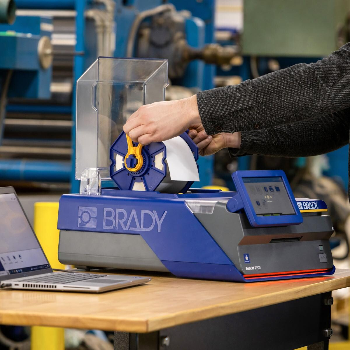 Kolorowa drukarka etykiet Brady J7300-EU do zastosowań przemysłowych z technologią druku atramentowego.