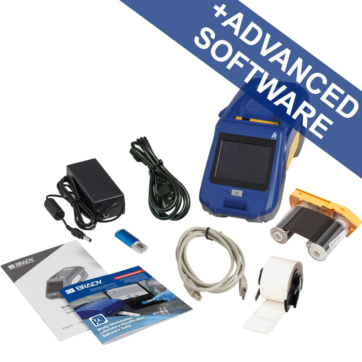 Opakowanie zawiera: Etykieciarka Brady M611-EU-LABS, solidna walizka podróżna, kabel USB, zasilacz, krótka instrukcja obsługi, dysk USB (informacje o produkcie i sterownik dla Windows), zestaw do projektowania etykiet Brady Workstation, rolkę etykiet M6-11-427 i taśmę M61-R4310.