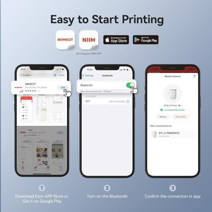 Dzięki połączeniu Bluetooth i wydajnej baterii litowej o pojemności 1500 mAh umożliwia etykieciarka Niimbot D11-H Smart druk etykiet aż 5 godzin na jednym ładowaniu. Jest kompatybilna z aplikacją Niimbot App dostępną dla Android i iOS, więc możesz wygodnie projektować i drukować etykiety bezpośrednio ze swojego smartfona lub tabletu.