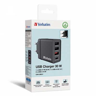 Opis produktu Verbatim 49700, Síťový adaptér 30W, 4 porty, 1x USB-C, 3x USB-A